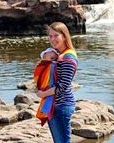 Note: The second sling pictured is a wrap conversion ring sling (WCRS), which is sort of a combination of a wrap (see below) and a regular ring sling. They offer a few more carry/position options, have higher weight limits, and can be worn over one or both shoulders. Both Etc. Slings and Girasol slings are WCRS. Like a wrap, they are a LOT of fabric (2 1/2 to 5 1/2 yards) so aren’t going to fit in your pocket like a regular ring sling.